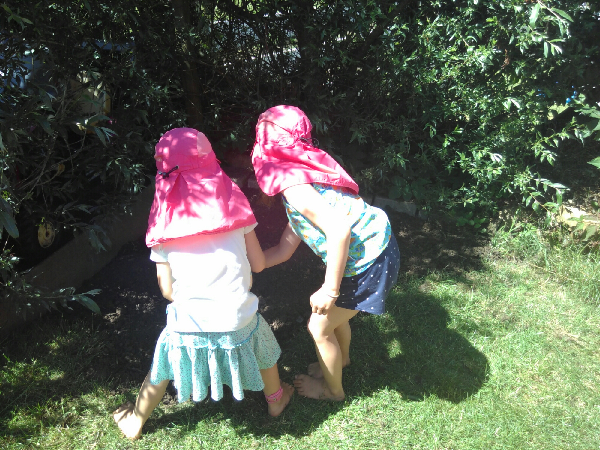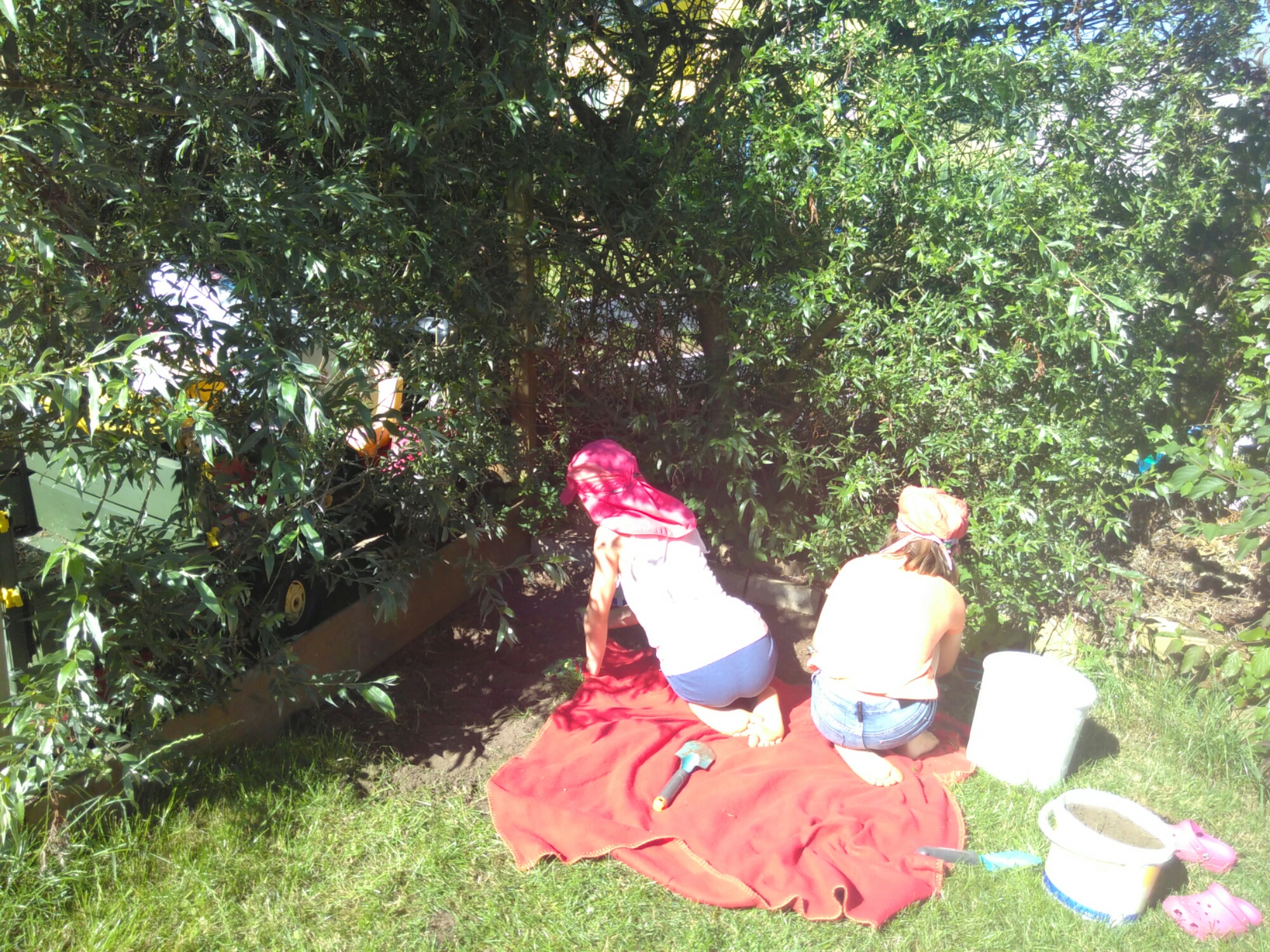 Barbara und ich befreien den Boden von Gras und Unkraut.